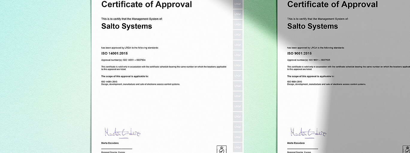 Die Zertifizierungen nach ISO 9001 und ISO 14001 belegen, dass Salto alle in den Normen festgelegten Qualitäts- und Umweltmanagementvorschriften erfüllt. Sie sind ein weiterer Beweis für das anhaltende Engagement von SALTO WECOSYSTEM für mehr Nachhaltigkeit. Ricardo García betont: „Stetige Verbesserung treibt uns an. Wir möchten über die Anforderungen der Normen hinausgehen und uns auf die SDGs (Sustainable Development Goals), den CO2- Ausgleich sowie nachhaltiges Design konzentrieren.“ Für Salto sind Qualität und Umweltschutz eine Verpflichtung gegenüber den Kunden, der Umwelt und allen Stakeholdern. Die erfolgreiche Absolvierung der Audits bescheinigt Partnern und Kunden weiterhin maximale Konformität und Verlässlichkeit.